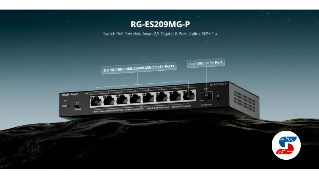 2. Switch Ruijie RG-ES209MG-P: 8 Port Manageable Switch dengan PoE untuk CCTV dan WiFi Access Point